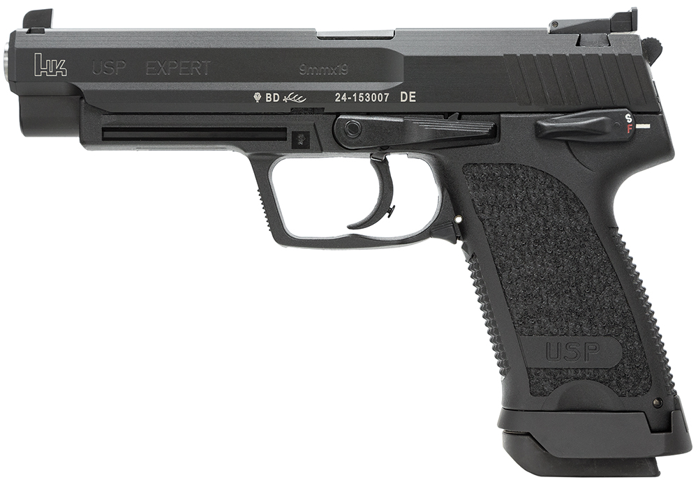 HK 81000363 USP Expert V1 9mm Luger Caliber with 4.25″ Barrel, 18+1 Capacity, Overall Black Finish, Serrated Trigger Guard Frame, Serrated Steel Slide & Polymer Grip Includes 2 Mags