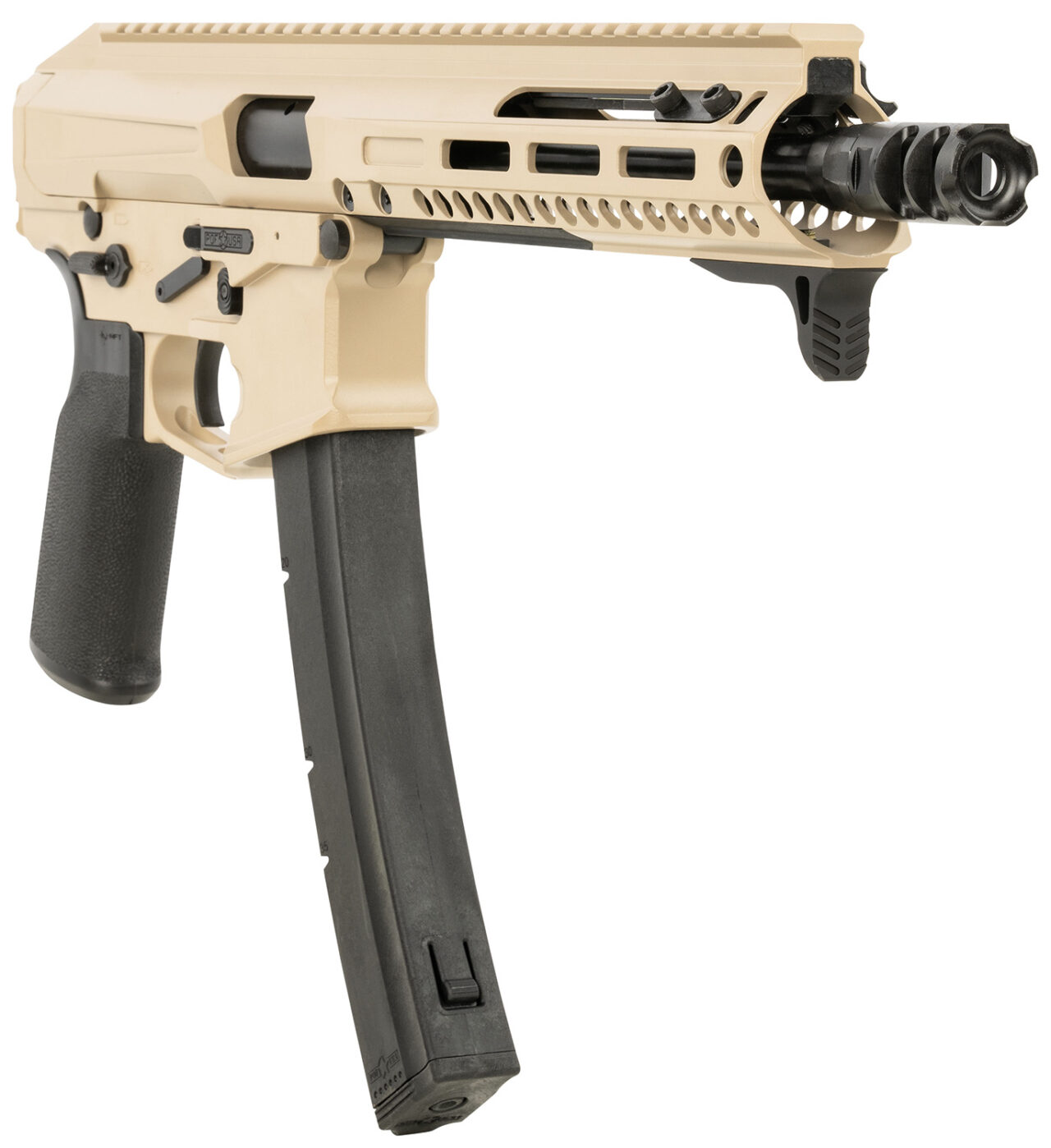 Patriot Ordnance Factory 01926 Phoenix 9mm Luger 35+1 8″, Flat Dark Earth Rec/M-LOK Handgaurd, Black MFT Grip, Picatinny Stock Adapter, Muzzle Brake, Includes Hand Stop